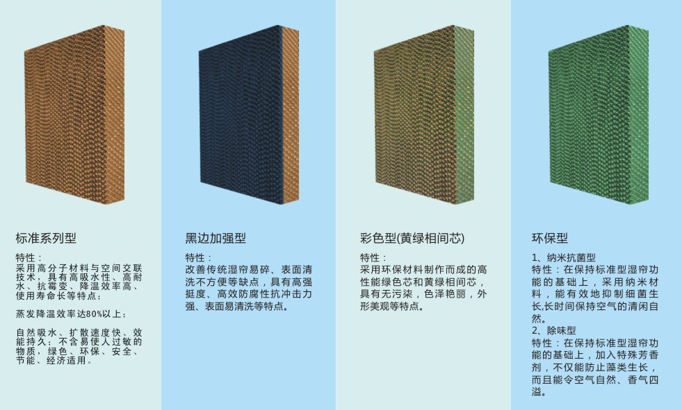 綠色濕簾型號(hào):5060/5090/7060/7090 優(yōu)質(zhì)濕簾還不含易使皮膚過(guò)敏的苯酚等化學(xué)物質(zhì),安裝使用時(shí)對(duì)人體無(wú)毒無(wú)害,綠色、安全、節(jié)能、環(huán)保、經(jīng)濟(jì)。